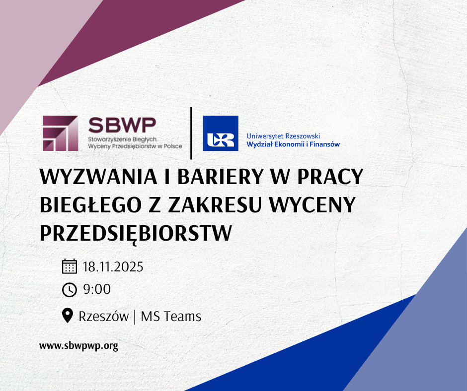 W imieniu Stowarzyszenia Biegłych Wyceny Przedsiębiorstw w Polsce oraz Wydziału Ekonomii i Finansów Uniwersytetu Rzeszowskiego serdecznie zapraszamy na seminarium z cyklu Wyzwania i bariery w pracy biegłego z zakresu wyceny przedsiębiorstw, które odbędzie się 18.11.2025 r. w Rzeszowie. Możliwy jest też udział online w seminarium.